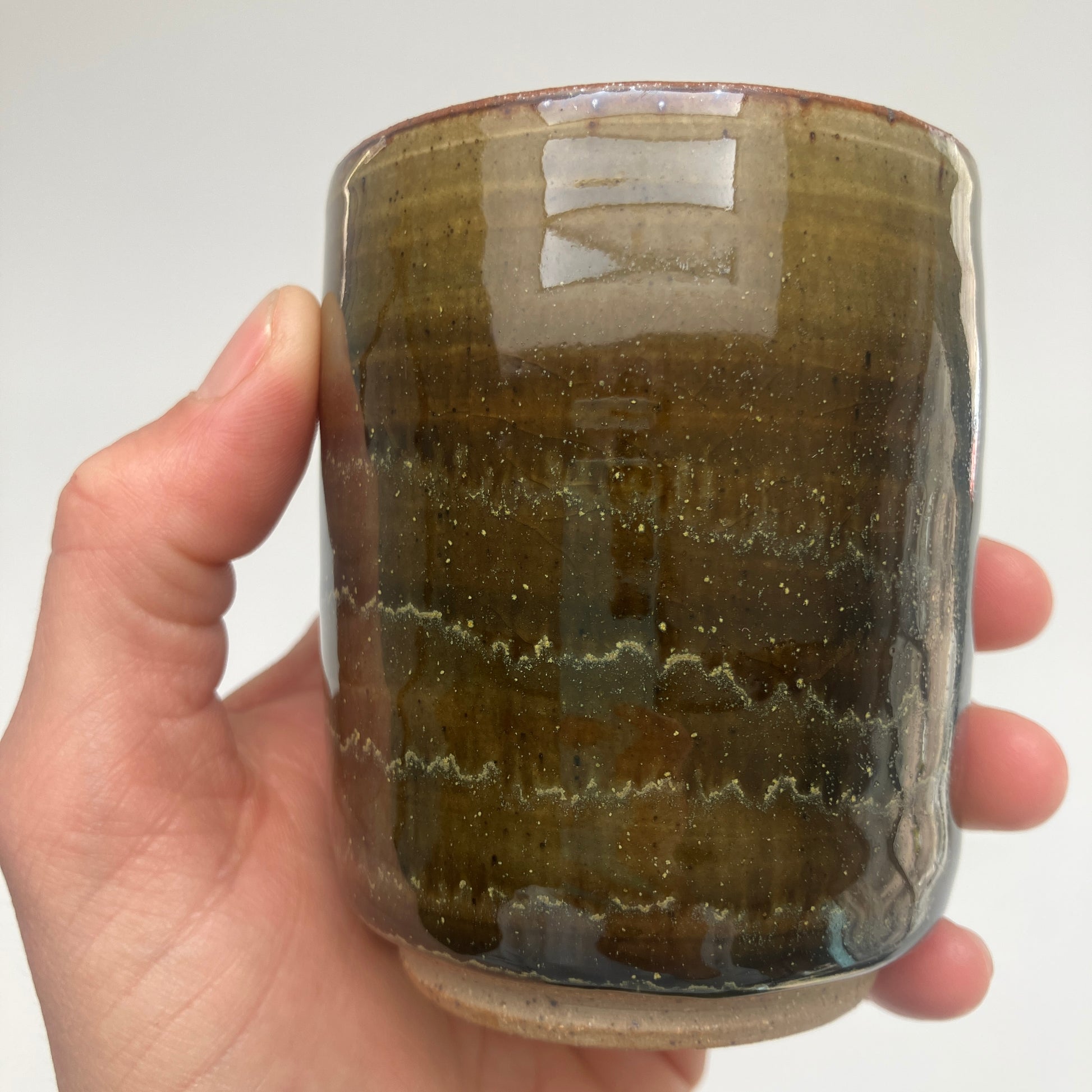 This teacup is finished in a combination of glazes, with a speckled green teadust being layered over a celadon colored glaze. Horizontal lines of wax resist have been applied to the first layer of glaze before the second layer is applied. Capacity is roughly 6-7 oz.