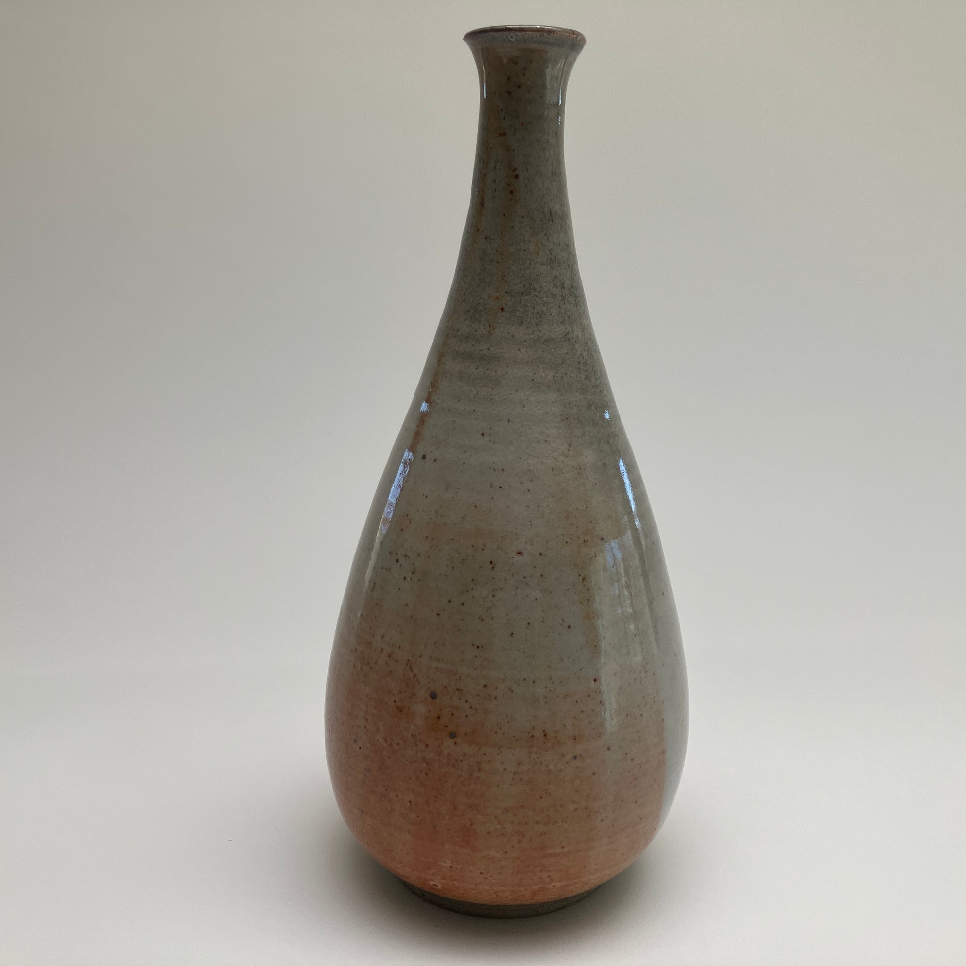 This tear shaped vase is simply finished in a shino glaze. The glaze has been applied with varying thickness, creating interesting variation in the finish. It has also "trapped" carbon from the kiln atmosphere during the firing, causing some areas to have a smoky appearance.