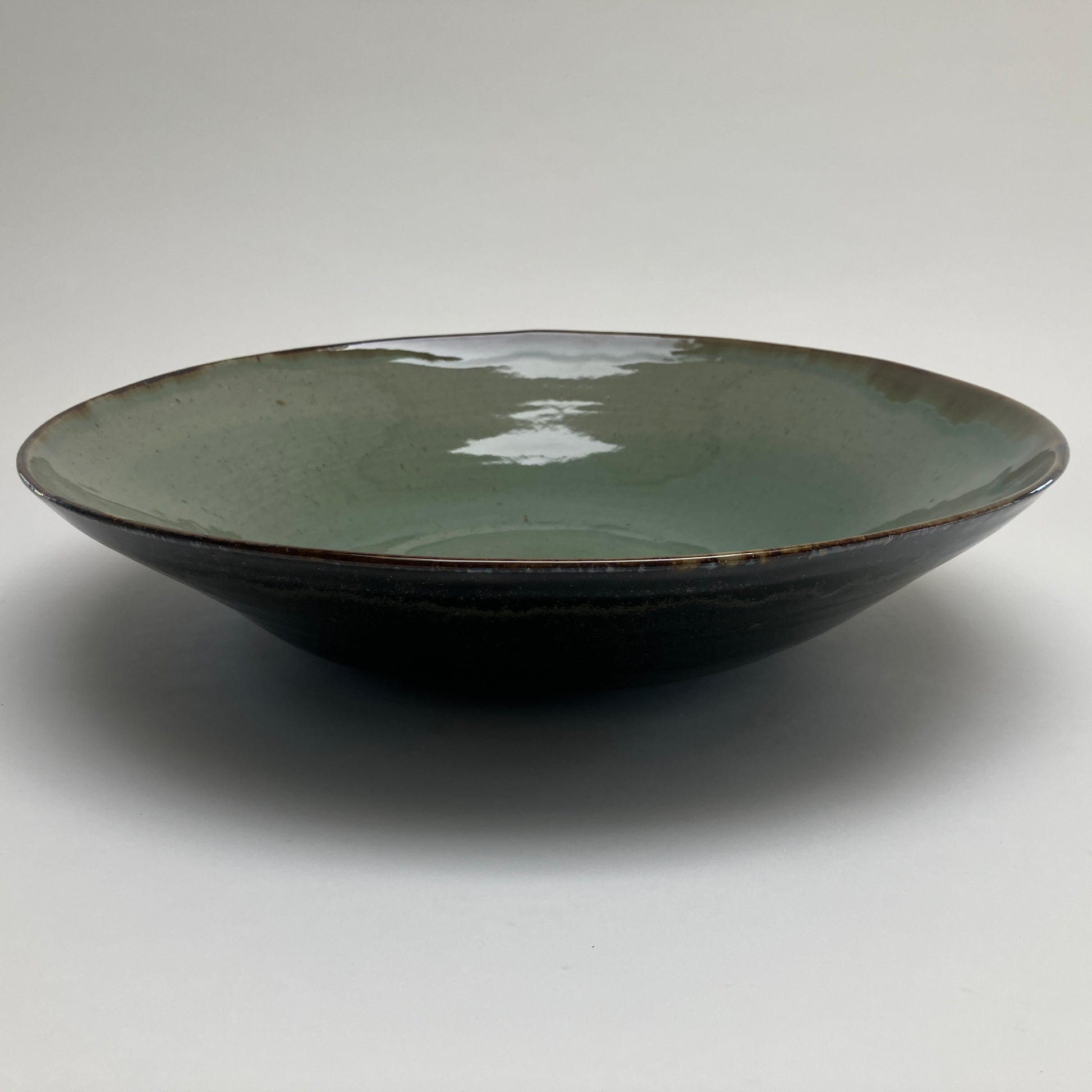 This large serving bowl is decorated with hand carved grasses and finished in celadon and speckled green teadust glazes.