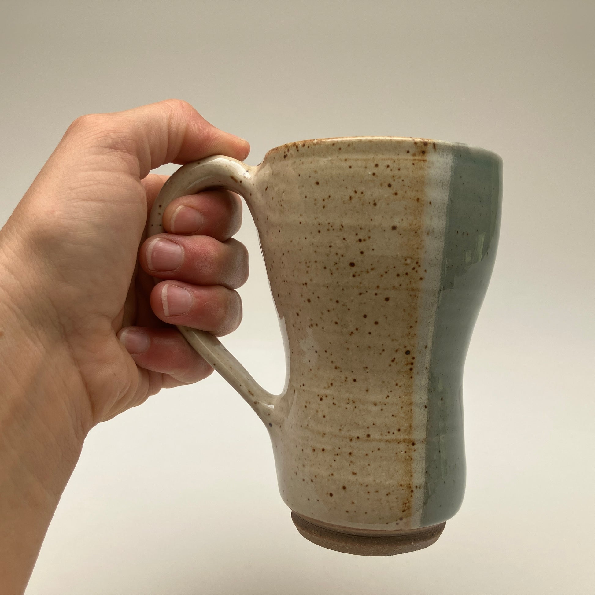 This tapered mug has a carved grass design and is finished in celadon and cream white glazes. Capacity is roughly 11-12 oz.