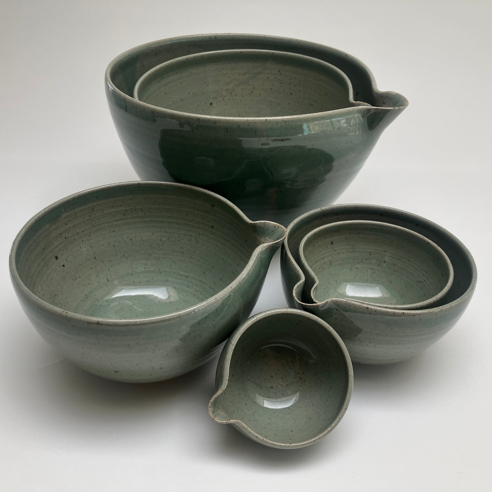This six piece nesting set of bowls is decorated with a series of hand carved feathers on the interior. It is finished in celadon and speckled green teadust glazes.