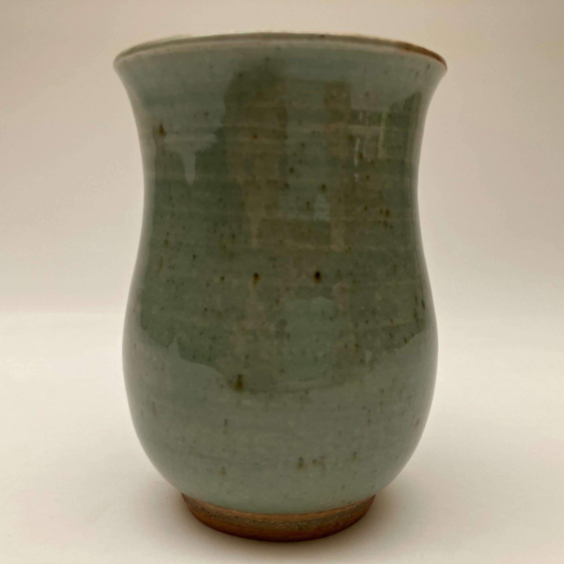 This small curvy mug is decorated with a hand carved depiction of native grassesand finished in celadon colored and teadust glazes. 6-7 oz capacity.