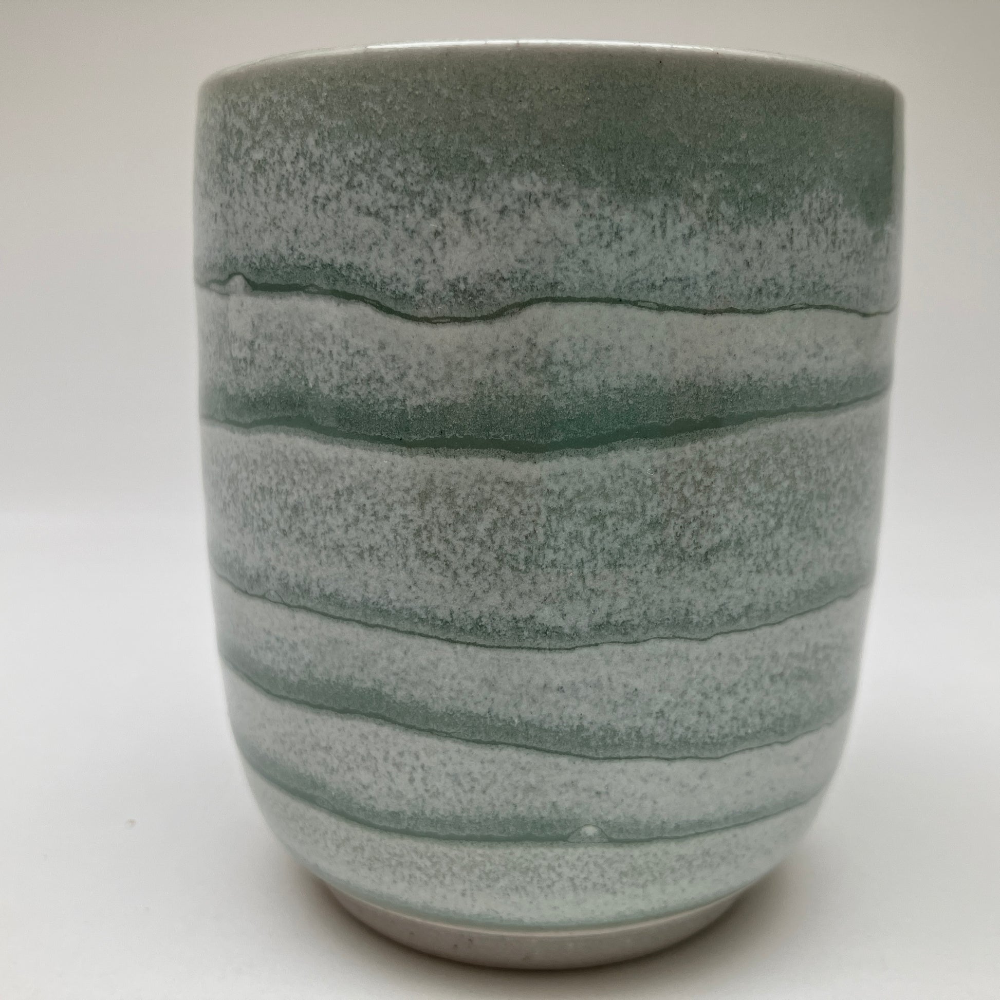 This teacup is finished in a combination of glazes, with a cream colored glaze being layered over a celadon colored glaze. Before the cream colored glaze is applied, horizontal lines of wax resist or painted onto the celadon colored glaze. Capacity is roughly 6-7 oz.