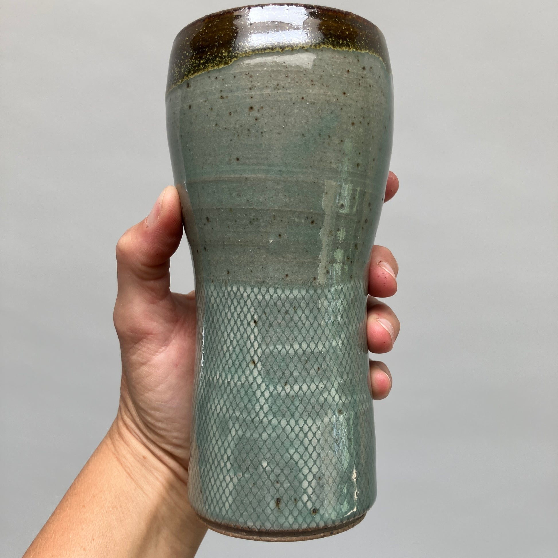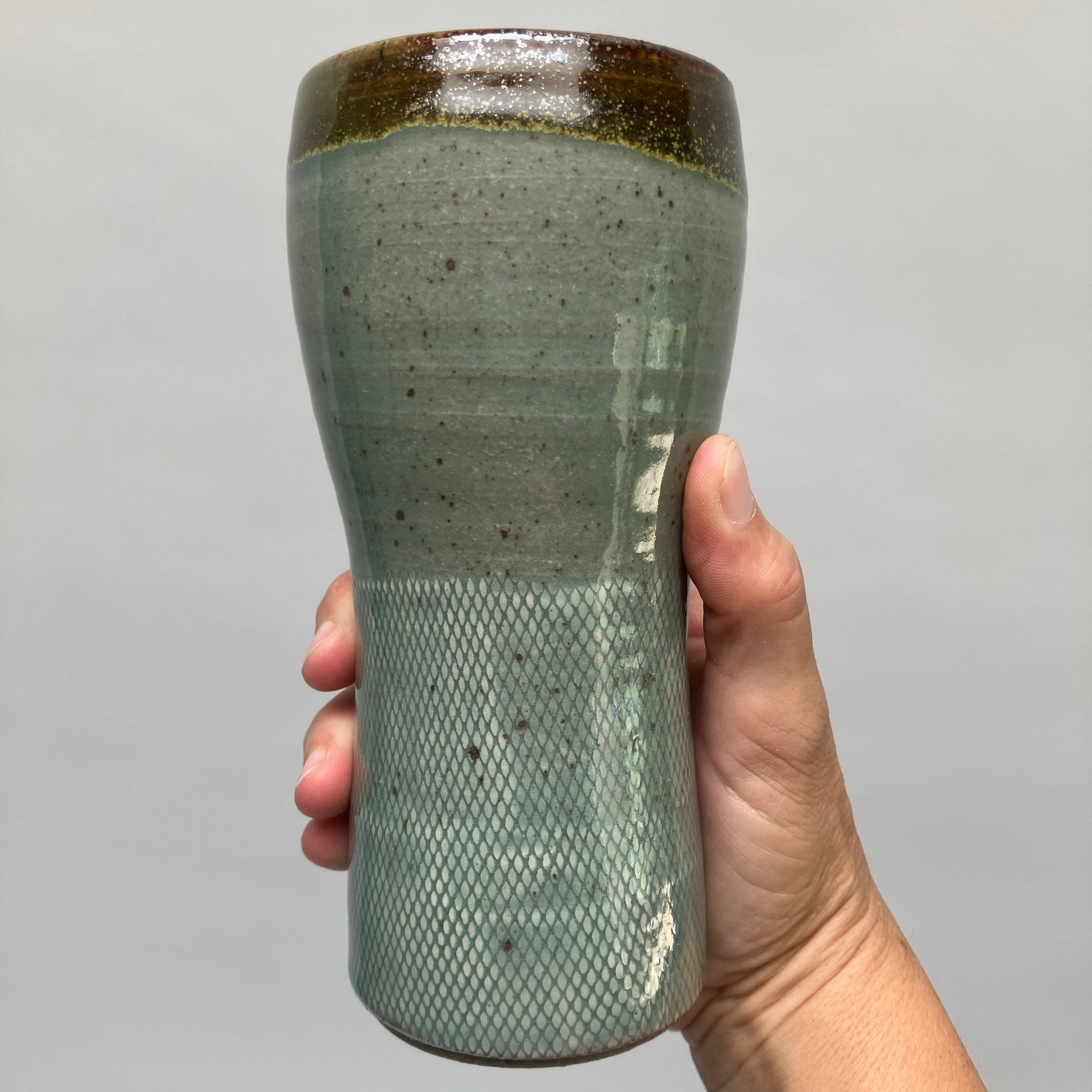 This is decorated with a crosshatch pattern, which is accentuated by the celadon colored glaze. The rim is accented with a teadust glaze. Capacity is roughly 16 oz.