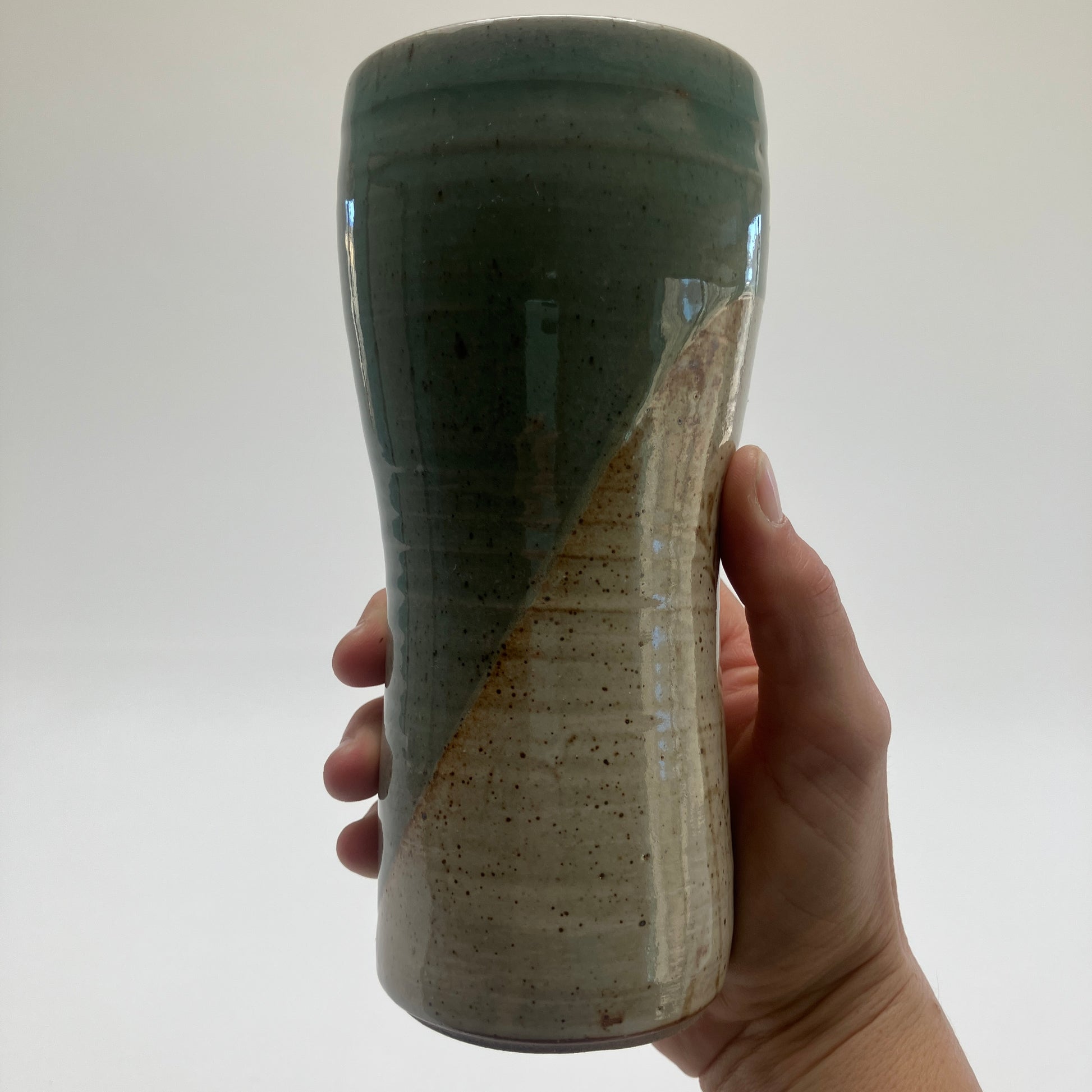 This is decorated with a subtle depiction of grasses. It is finished in cream white and celadon colored glazes. Capacity is roughly 16 oz.