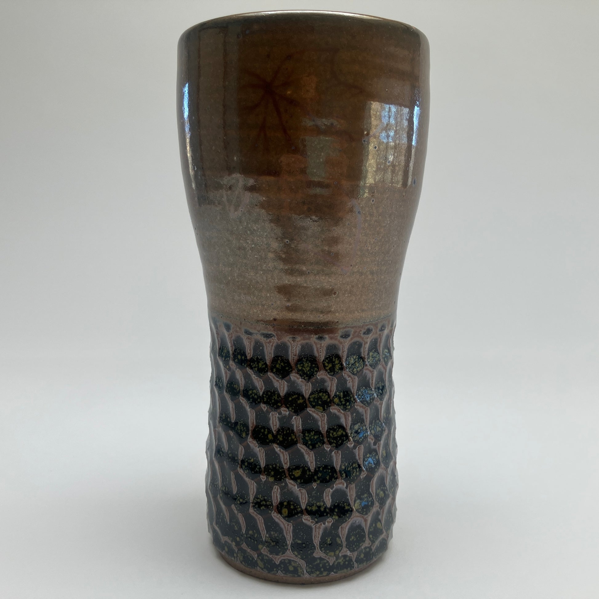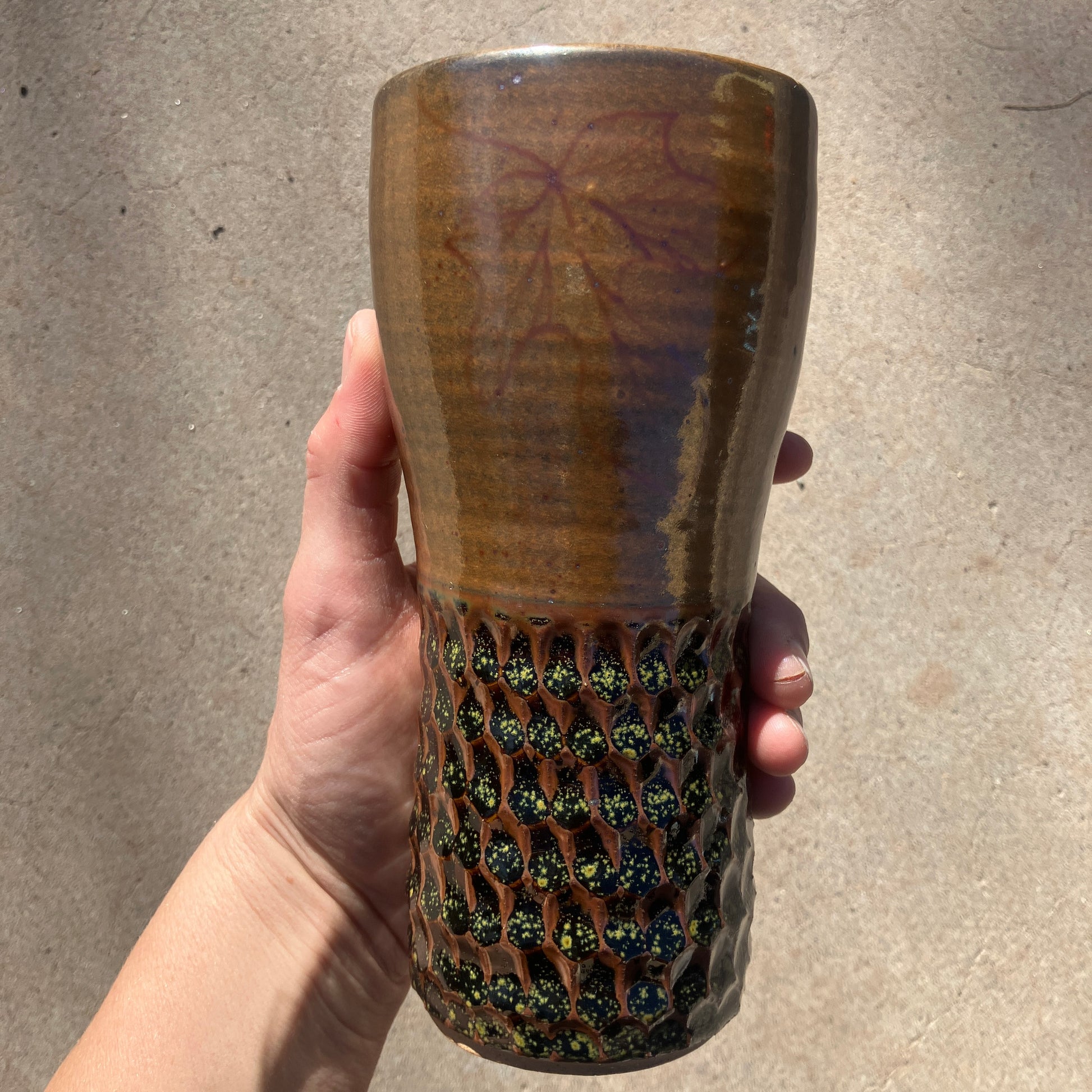 This pint has a hand painted depiction of a potato vine leaf on top and a carved pattern of hexagons on the bottom. It is finished in shino and speckled green teadust glazes. Capacity is about 16 oz.