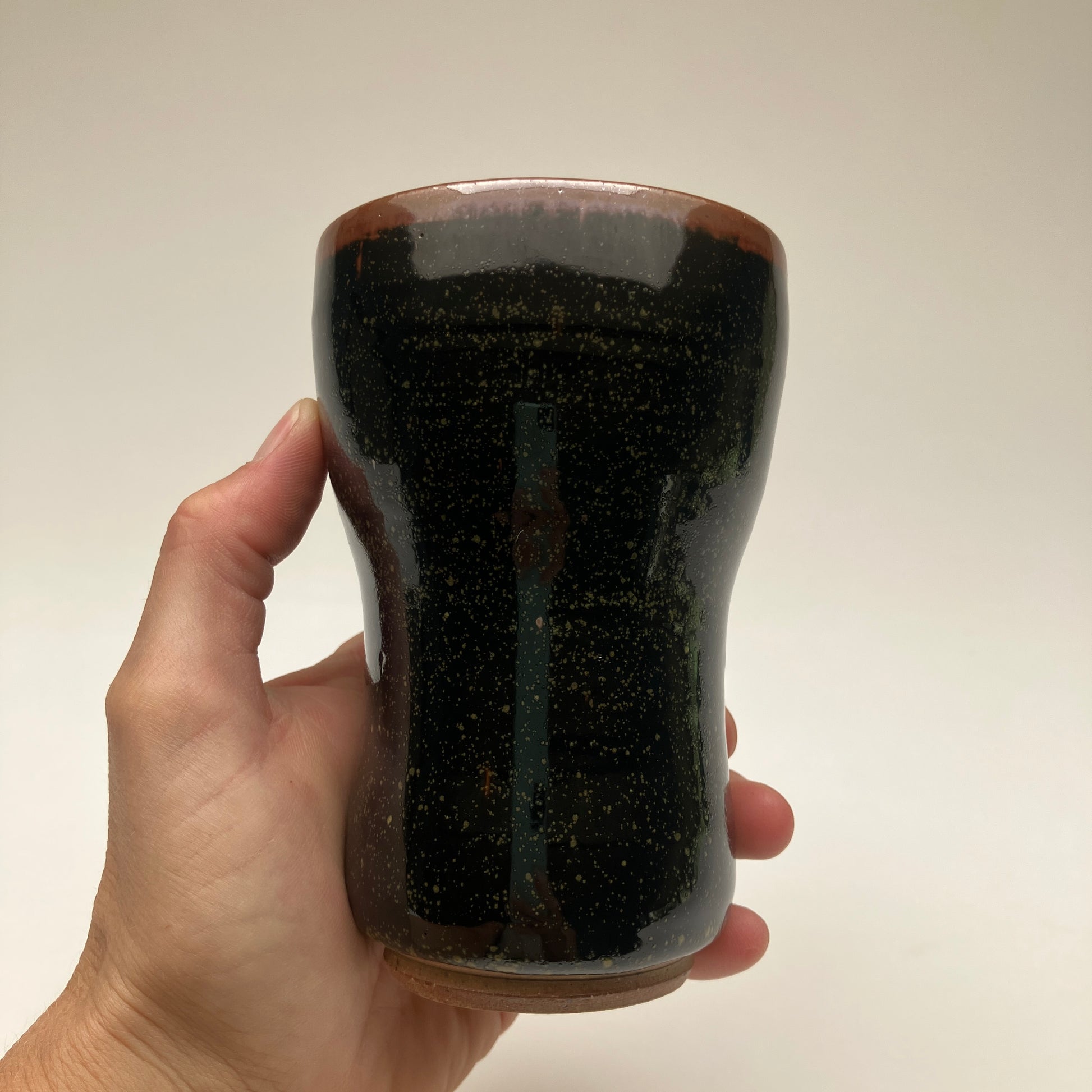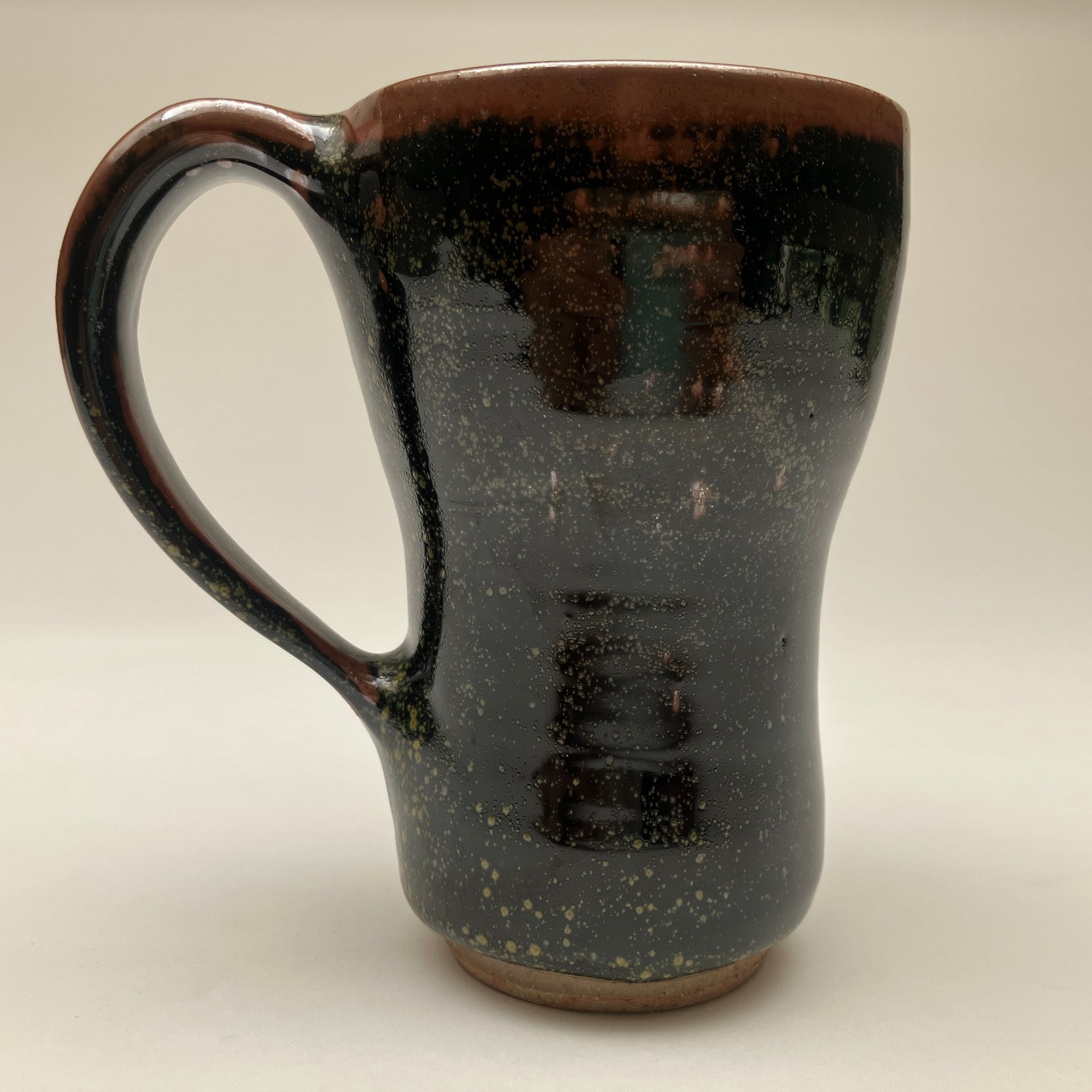 This tapered mug is finished in a teadust glaze with that has fired with subtle green speckles against a dark background. Capacity is 11-12 oz.
