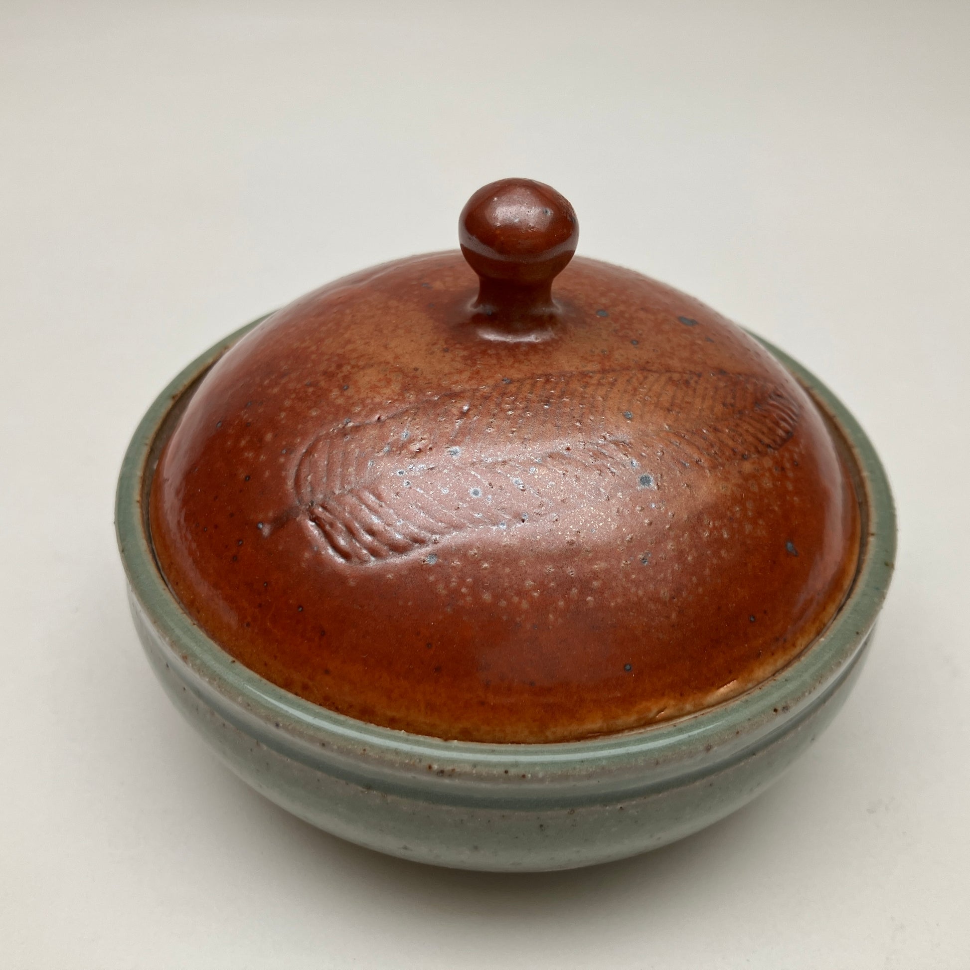 This salt cellar is finished in shino and celadon colored glazes. If you look closely, you'll notice a subtle hand carved feather on the lid. Spoon included.