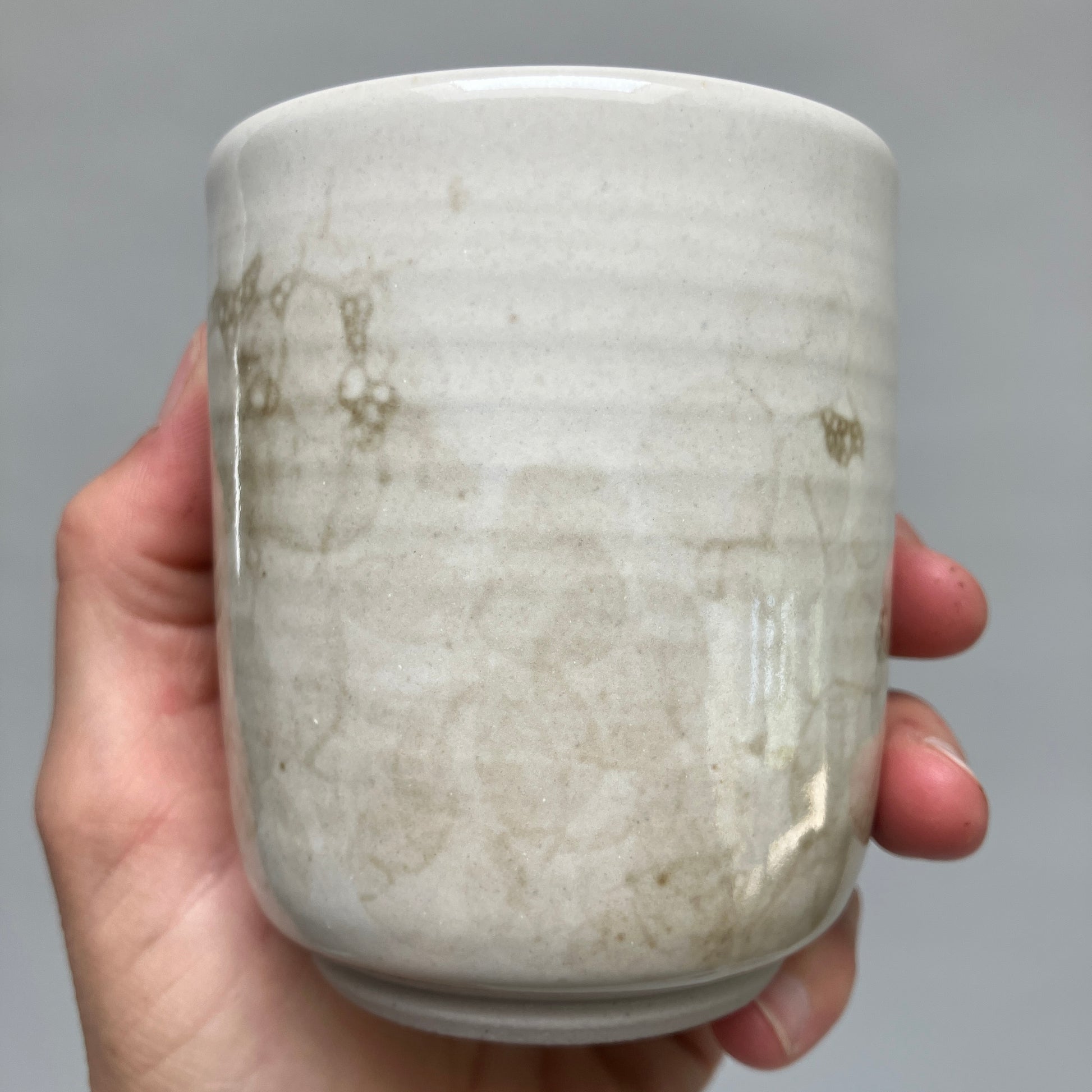 This teacup is decorated by applying iron oxide to the surface in the form of bubbles, which burst upon contact, creating the markings shown. Capacity is about 6-7 oz. Dimensions are roughly 3 inches (L) x 3 inches (W) x 3.25 inches (H).