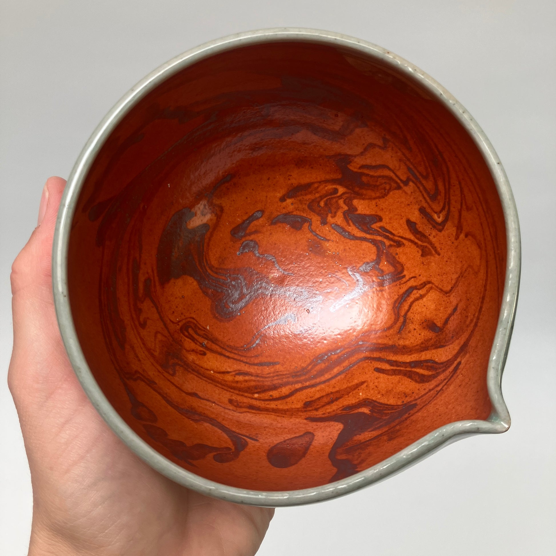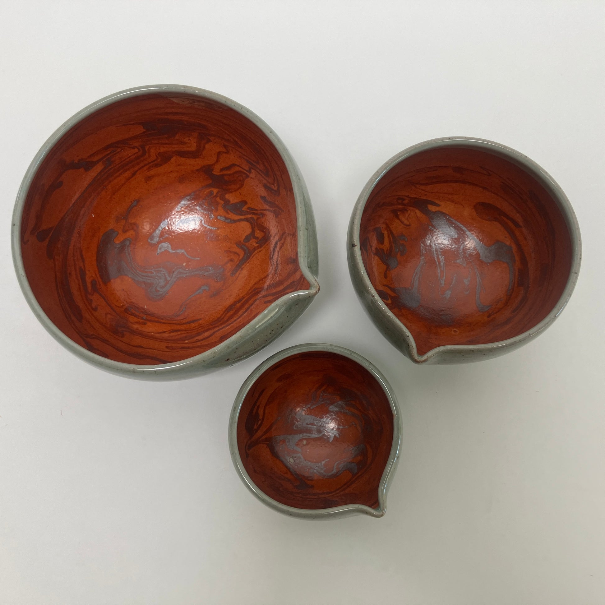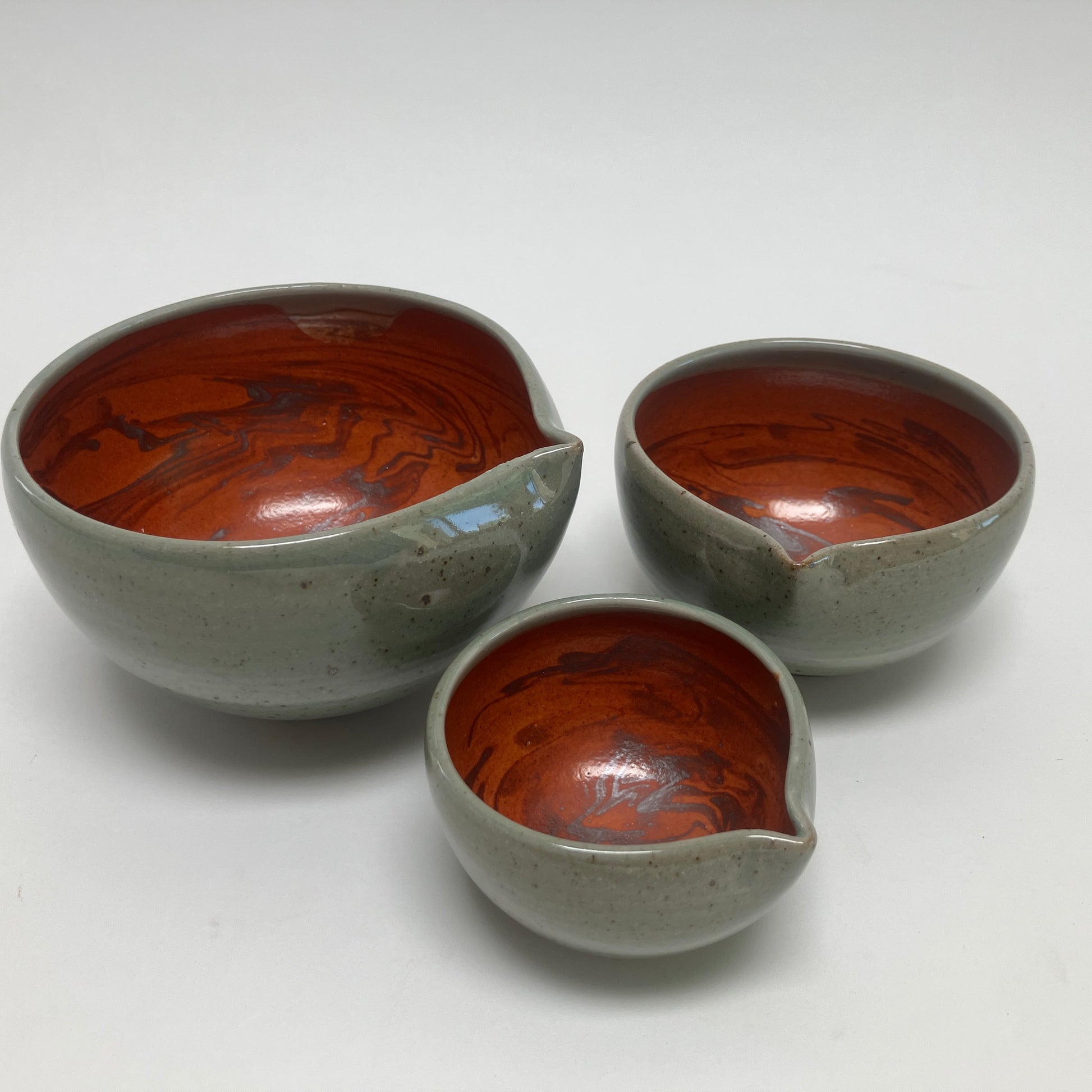 This small nesting set is decorated on its interior using a slip marbling technique. It is finished in shino and celadon colored glazes. Multiple sizes allow for various serving dishes or containers for pre-measured ingredients.