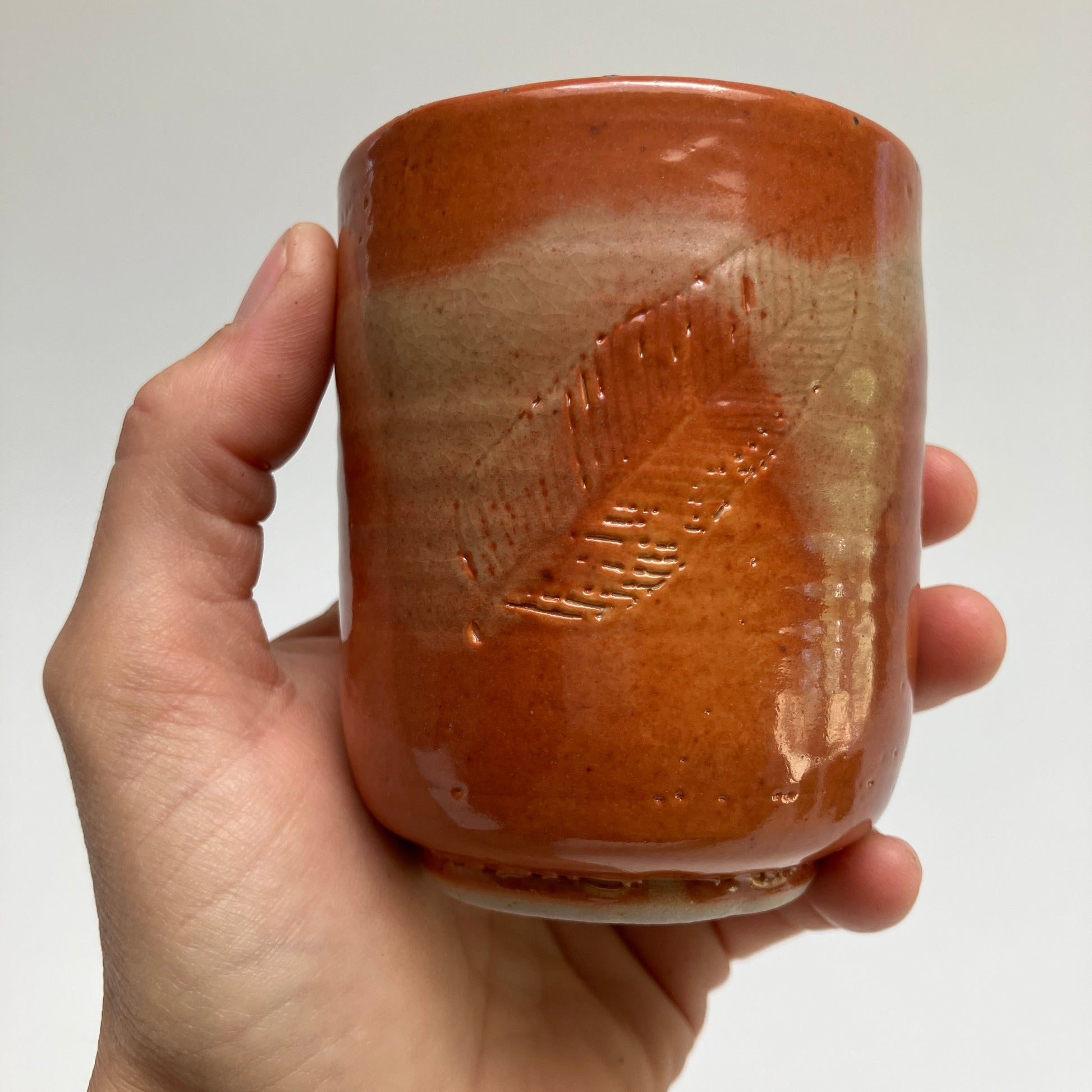 This teacup has a carved feather and is finished in an orange shino glaze. 7-8 oz capacity.