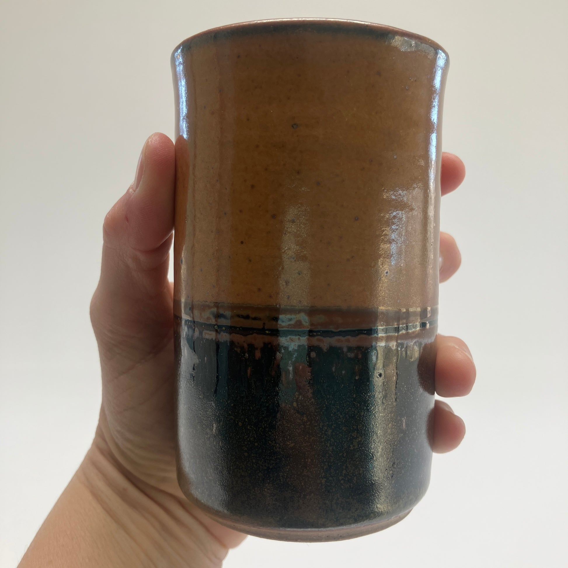 This tumbler is decorated with hand carved grasses and is finished in shino and teadust glazes 10-11 oz capacity.