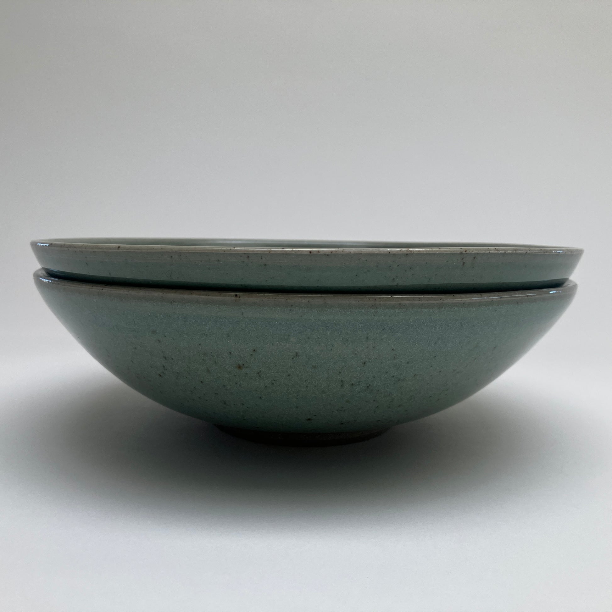 These stoneware pasta bowls are finished in either a celadon colored or speckled green teadust glaze. Please note that glaze finish may vary from piece to piece.