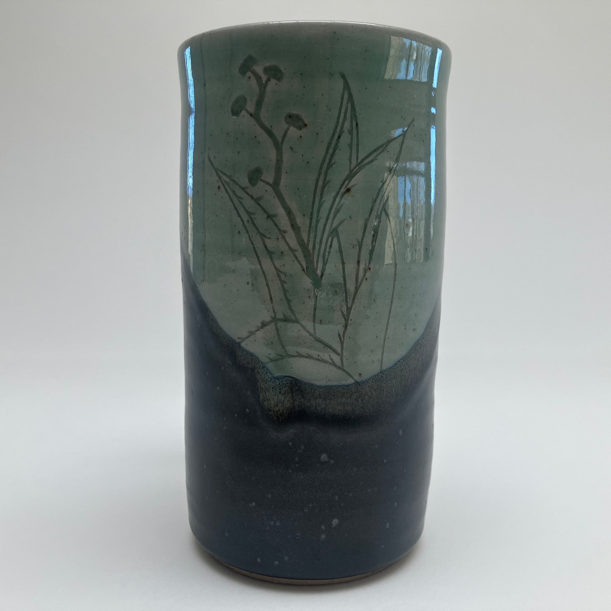 This tall mug is decorated with carved depiction of a yucca and finished in celadon and matte black glazes. 14-15 oz capacity.